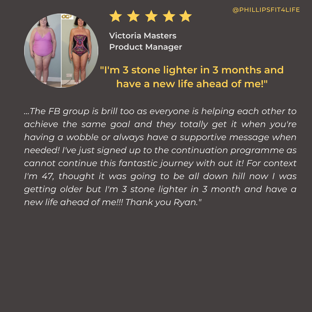 Victoria continued the programme after 90 days and has now been with us for over a year having lost 8 stone (50 kg) and still going strong...