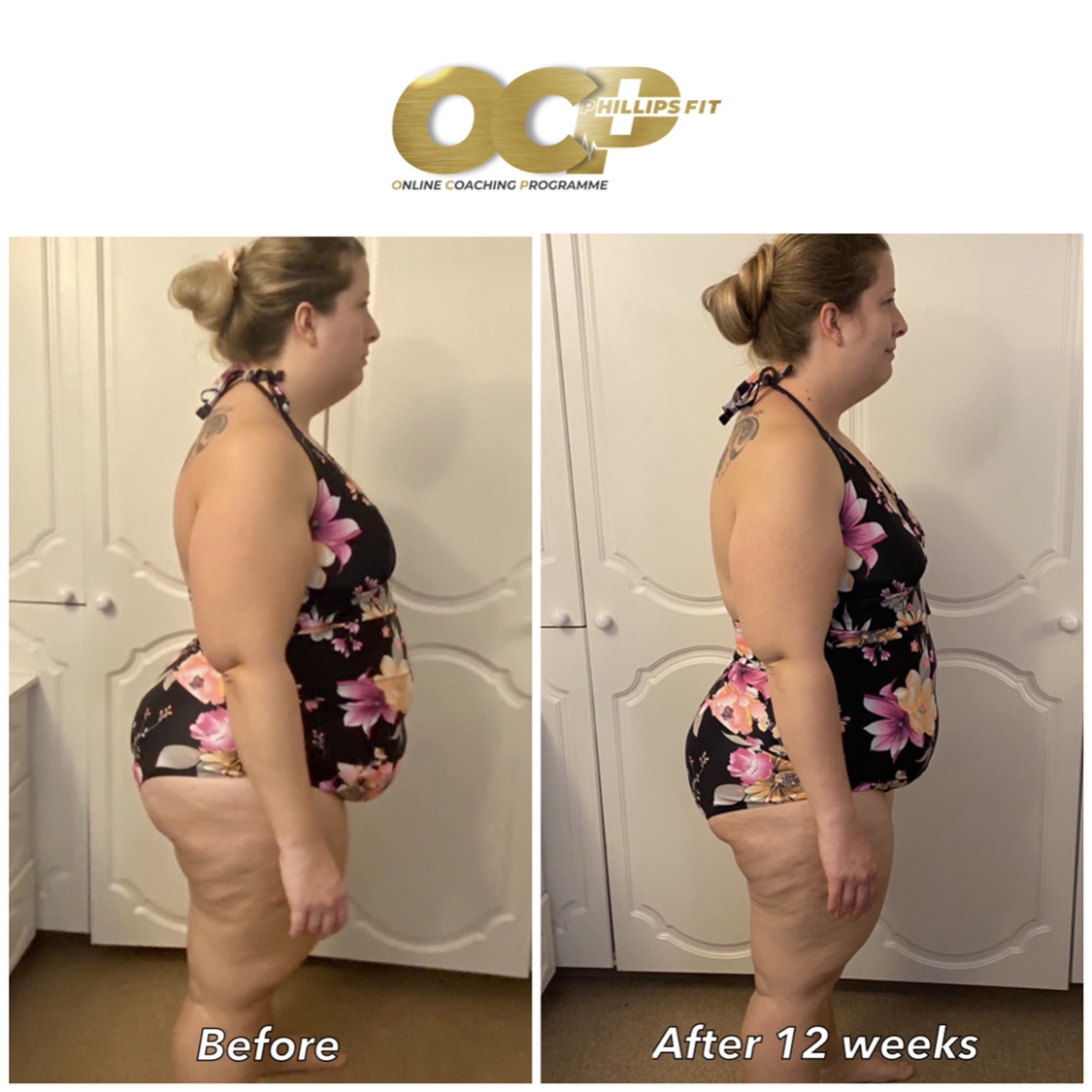 By the end of the 12 week programme Vicki lost over 11lbs (5 kg) and 14 inches (35.5 cm) off her body...